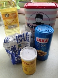 2) Put the flour in a mixing bowl or large pan sprinkle with salt then gradually pour in the liquid while mixing with a metal spoon. Add a glug of sunflower oil.
