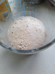 1) In a measuring jug put the yeast, sugar and fill to approx a quarter full with warm water from the tap.