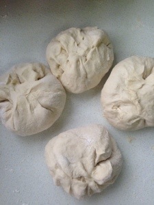 3) Divide the dough with a pair of scissors into 5. Flour the work surface and a rolling pin. Form the dough into balls.