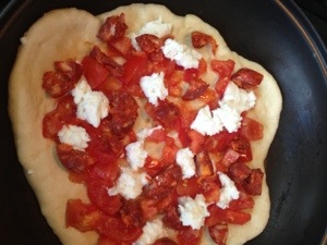 5) Put your toppings on the pizza while it is in the pan. I used some old tomatoes chopped up, microwaved for 2 mins. Leave the thin juice in the bowl and use the lumpy bits.