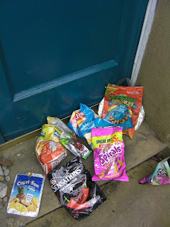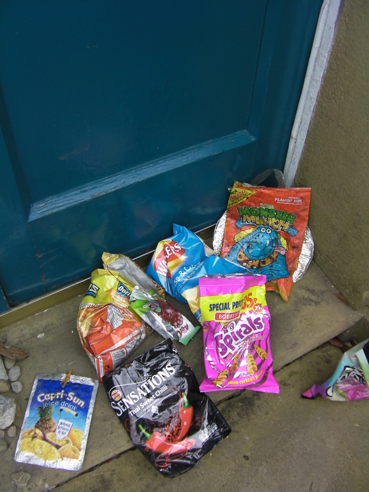 Strangely, all the litter of the neighbourhood seems to get sucked into a vortex and then deposited on our doorstep. Daily. Here is a photograph of today’s selection with ‘Spirals’ (the pink packet) emerging as the most desirable newcomer of the day.