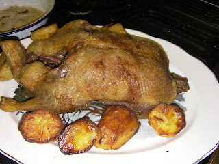When you pull at the leg it should come away like a confit leg and the skin should be super-crispy with no white fat left beneath it. It can sit out of the oven while you whack up the heat and roast the potatoes in the duck fat while making a gravy with the stock. Yum yum.
