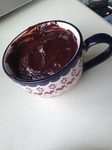 20140603-144505.jpg then I poured a bit of double cream into the cup, broke 4 Asda Value dark chocolate pieces into it, melted (about 30 seconds) in the microwave, mixed it up then popped the cake back in and covered it with the yummy sauce.
