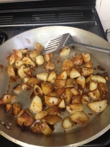 But what if the Slinger’s didn’t like my biryani rice too? Then poor Mother Slinger would have to cook for them all when they were home and that wasn’t fair. So I started frying potatoes. Then, when I took the pork chops out of the braising pan there were all these lovely, mushy apple slices and pork juices so I decided to make a sauce.
