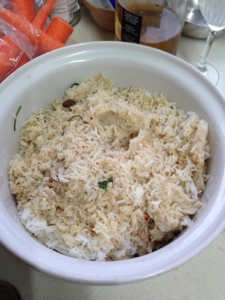 I had rather a lot of biryani rice left over from the night before (not the one my kids refused to eat but another one that my husband had not been too keen on either) and some plain white rice. All I had to do was heat the rice and cook a vegetable.