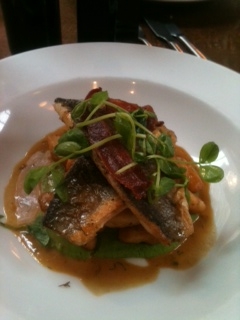 | Seabass on pea purée with gnocchi and crisped pancetta |