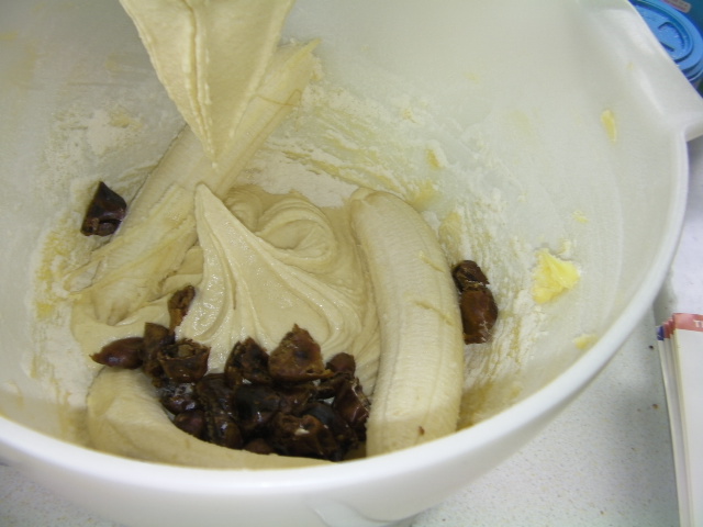 I had found a few old dates at the bottom of a bag and thought I may as well dispose of them in the banana bread.  You may note from the picture that I DID bother to chop them up.  The only reason for this act of non-laziness was that I thought I had better check each one for hidden burrowing creatures.