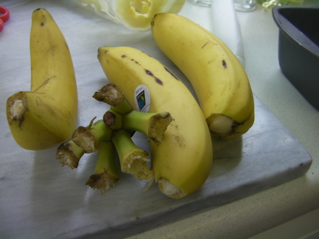 It refused to mix.  I don’t know if that was because of the oily butter or the great big sugar crystals but the two ingredients definitely didn’t get on.  Undeterred I threw in the eggs.  Yes, the mixture curdled so I threw in the flour.  All I had to do next was mash the bananas.  Why would I need to do that if they were going to get mixed up anyway?  So I put them in whole.