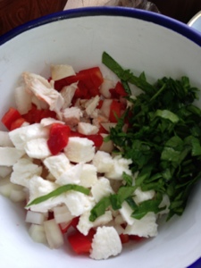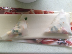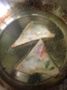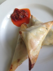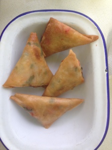 That’s left over roast chicken bits with leftover mozzarella, onion, chilli and spinach. Clever little me did this with it, which would horrify my friend Rhuksana. She always makes her own samosa pastry and her children have never tasted anything other than home made food. I mean completely home made. From scratch. Everything. Anyhow, being me and a bit lazy and pushed for time I bought this fabulous samosa pastry which is just so well behaved that I love it.