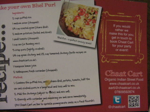 We had Bhel Puri (which I always thought was some kind of facial paralysis) from Chaat Cart who get my vote because there was no turmeric in the spicy rice crispy concoction.  Here’s a pic of their recipe for it.