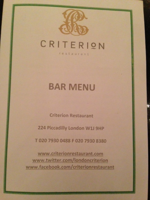 Criterion bar menu Published February 25, 2013 at 480 × 640 in Zedel’s, Criterion, Hix; lovely London during Fashion Week.